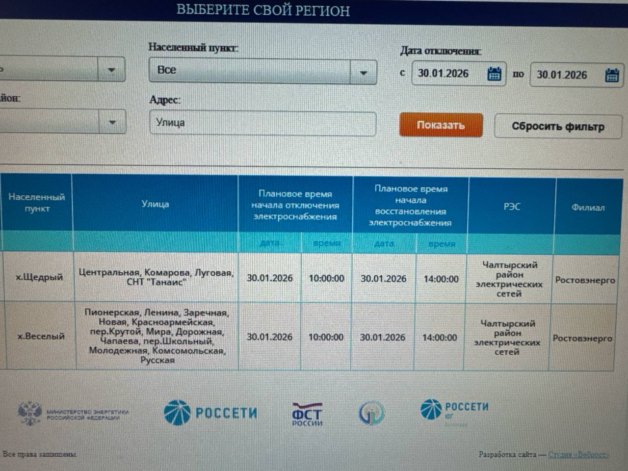 МУП "Мясниковское ВКХ" информирует: В связи с плановым отключением электроэнергии с 10-00ч до 15-00ч. 30.01.2026 в х. Весёлый и х. Щедрый будут обесточены и водоочистные сооружения (ВОС х. Веселый) и скважина х. Щедрый, которые обеспечивают водоснабжением вышеуказанные населённые пункты. В связи с чем возможны перебои с водоснабжением.