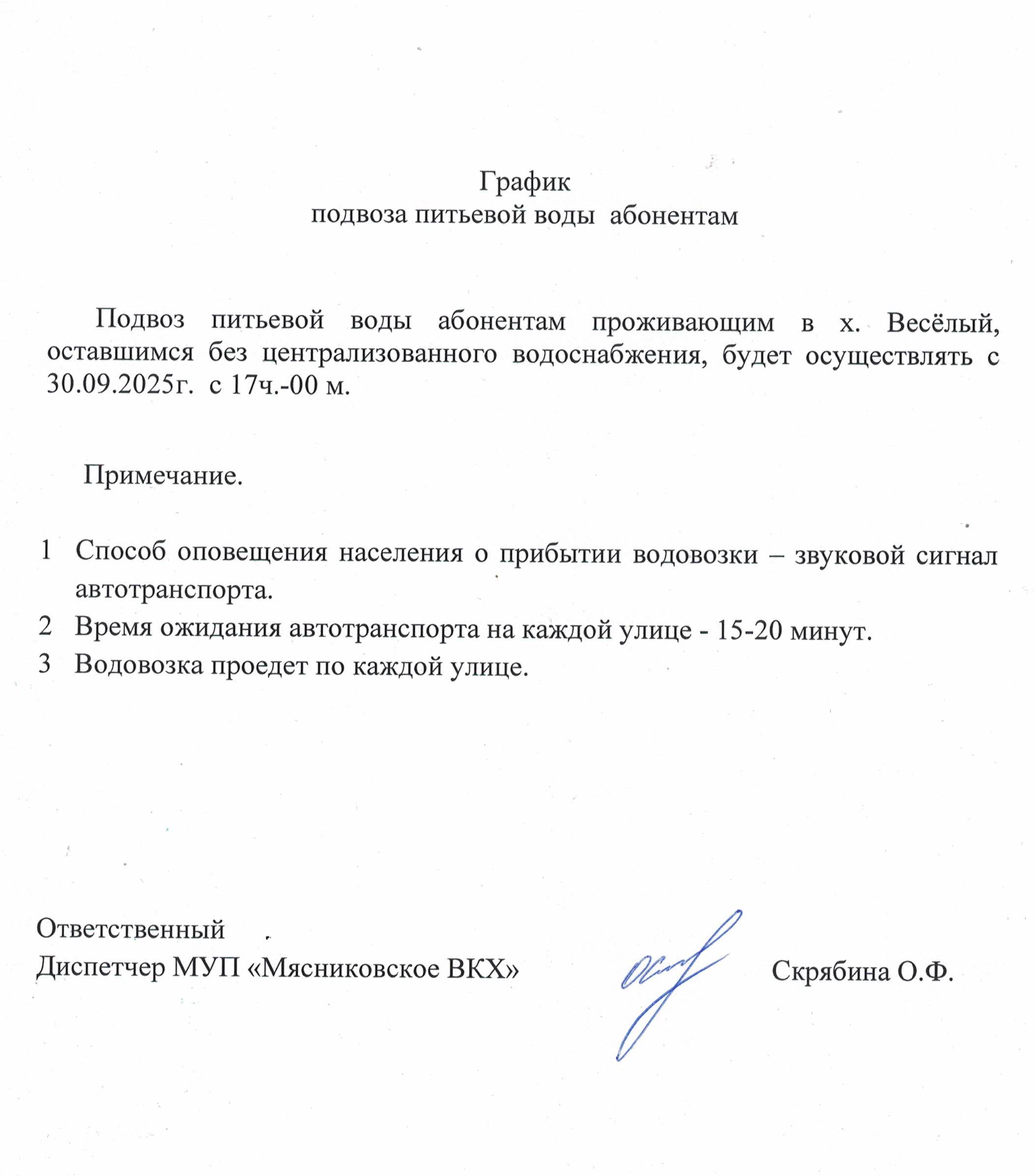 Подвоз питьевой воды абонентам проживающим в х. Весёлый, оставшимся без централизованного водоснабжения, будет осуществлять с 30.09.2025г. с 17ч.-00 м.