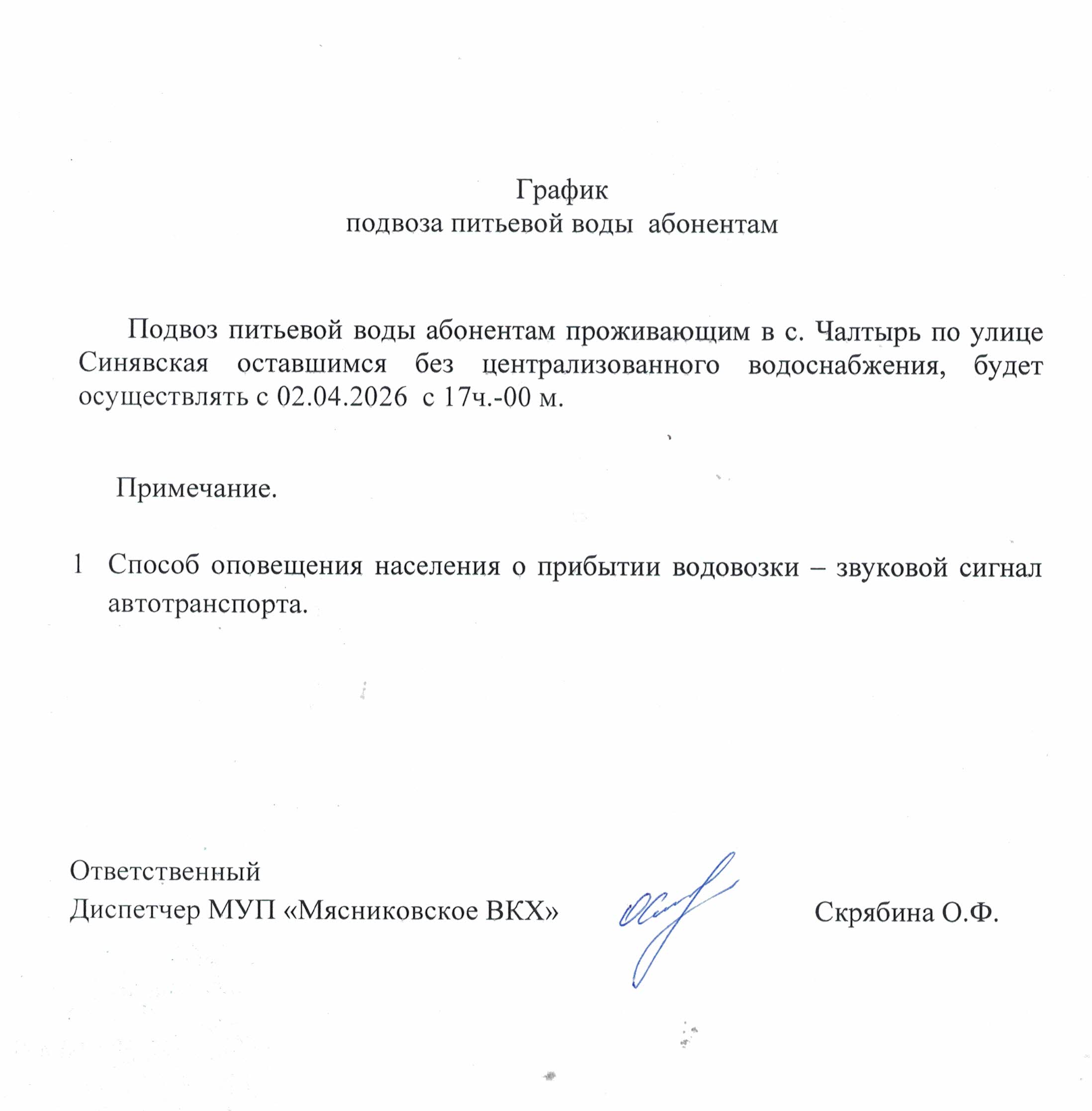 Подвоз питьевой воды абонентам проживающим в с. Чалтырь по улице Синявская оставшимся без централизованного водоснабжения, будет осуществлять с 02.04.2026 с 17ч.-00 м.